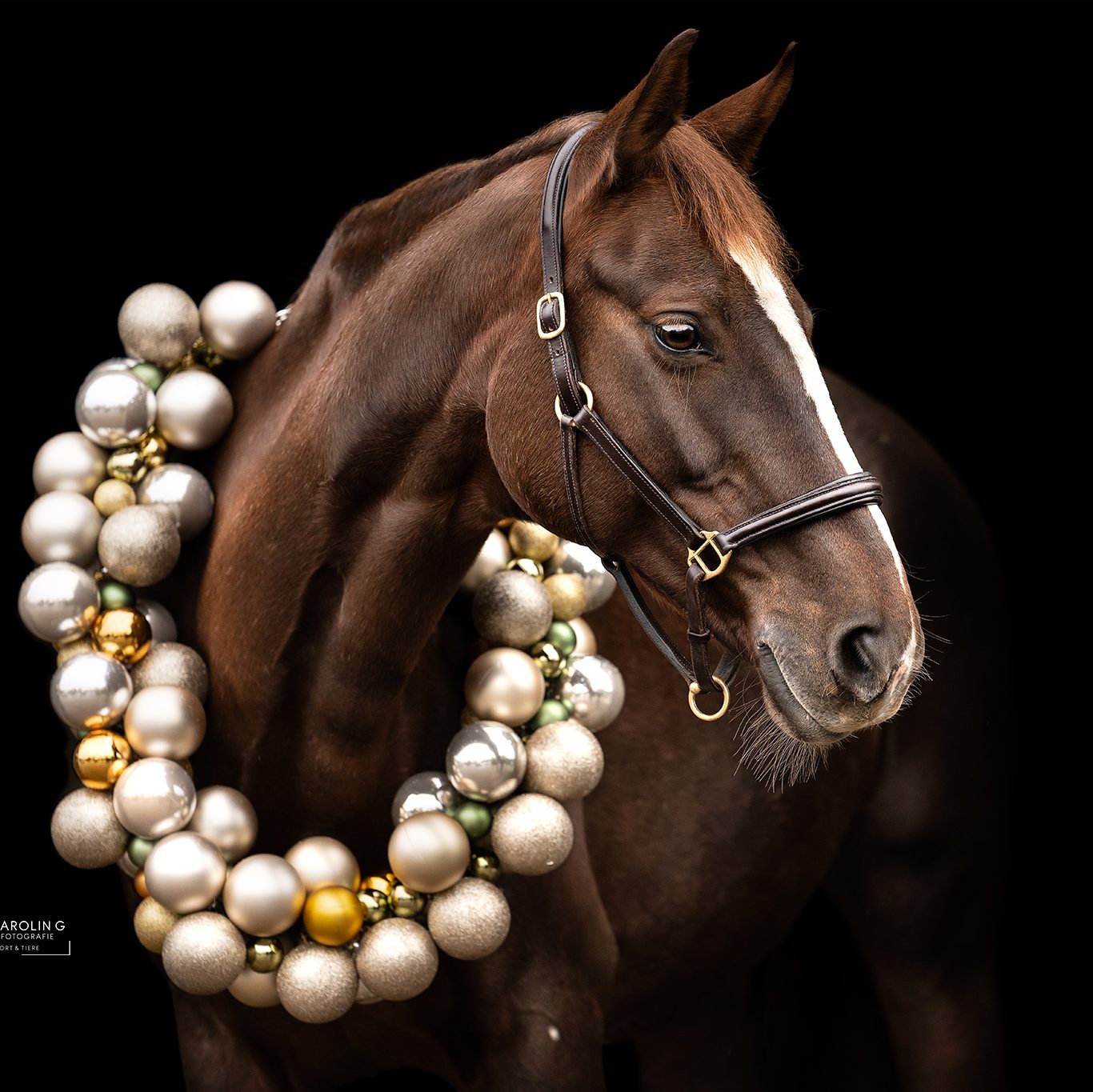 Ein Klassiker für edle Portraits ist definitiv das Lederhalfter. Es ist schlicht aber trotzdem schick und du hast damit eine bessere Einwirkung auf dein Pferd, sollte es doch mal während des Termins erschrecken.
